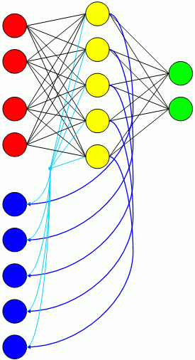 In der Trainingsphase wurden die berechneten Output-Werte mit den Korrekten verglichen (supervised learning) und die Gewichte mit Hilfe der "Backpropagation-through-time" Lernregel angepasst (Botvinick und Plaut, 2004). Zu beachten ist, dass der generierte Output teilweise als Eingabe der Input-Units für den nachfolgenden Schritt fungierte. Somit hätte man in Abbildung 26 auch die Output-Units noch mit den Input-Units verbinden können.